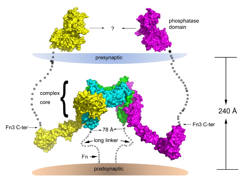 图1、突触后膜上的SALM5(绿色/天青色)诱导并激活突触前膜上的受体PTPδ(黄色/洋红色)二聚化的结构机制【Nature Commun.2018 Jan 18; 9(1):268】。