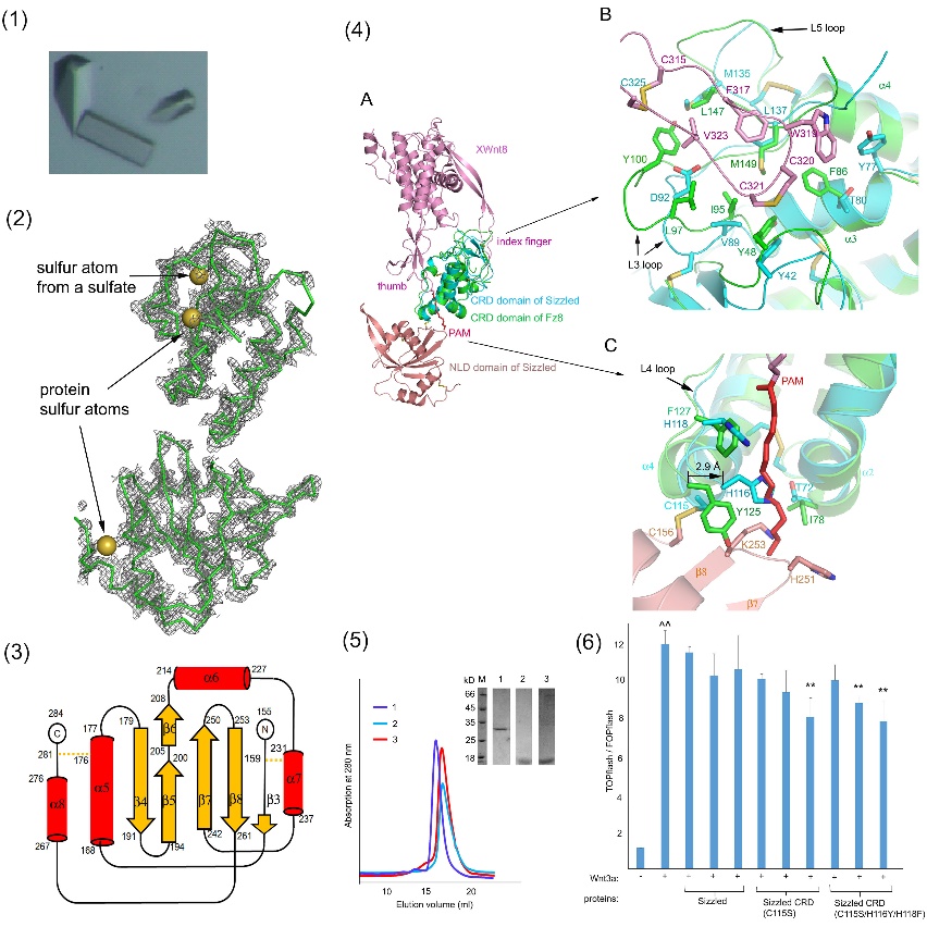 图2、Sizzled的结构和功能关系。(1)非洲爪蟾Sizzled的晶体;(2)利用单波长反常散射法找到三个硫原子,并以此计算相位合成的电子密度图可见Sizzled含有两个相对独立的结构域;(3)结构分析表明其NTR结构域具有新的折叠模式;(4)A、比较Sizzled全长结构(CRD结构域,天青色;NTR结构域,浅棕色;PAM,棕榈酰基团,红色)与mFrizzled-XWnt8复合物结构(mFrizzled的CRD结构域,绿色;XWnt8,粉色);B、两结构在XWnt8 index finger区域的差异细节;C、两结构在XWnt8 thumb区域的差异细节;(5)Sizzled以及突变体Sizzled CRD C115S、Sizzled CRD C115S/H116Y/H118F的分子筛色谱图以及SDS-PAGE结果;(6)在Wnt3a引发HEK293细胞的双荧光实验中,相较于野生型Sizzled,其突变体可显著地拮抗Wnt3a信号。