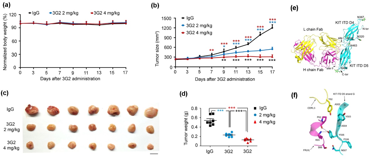 图3、3G2抗体抑制小鼠体内Ba/F3 KIT ITD肿瘤生长及与抗原的复合物结构。(a-b) Ba/F3-KIT ITD502-503异种移植小鼠在分别给予2 mg/kg、4 mg/kg的3G2抗体及4 mg/kg的IgG(对照组)后测量的体重(a)和肿瘤尺寸(b);初始体重设为100%。(c-d) 在第17天处死小鼠后所取肿瘤的照片(c)和瘤体重量(d)。比例尺:1cm。对于(a)、(b)及(e)所展示数据为平均值±均值标准误差(以误差线表示)。用Microsoft Excel软件的双尾Student’s t test计算p值;***p < 0.001,**p < 0.01,*p < 0.05。(e)KIT D4-D5 ITD与3G2 Fab复合物结构的飘带模式图;(f)KIT ITD突变区与3G2互作的界面,参与相互作用的氨基酸以棍棒模式展示,氢键以虚线展示;颜色代码:KIT D4-D5 ITD,天青色;3G2重链,紫色;3G2轻链,黄色。